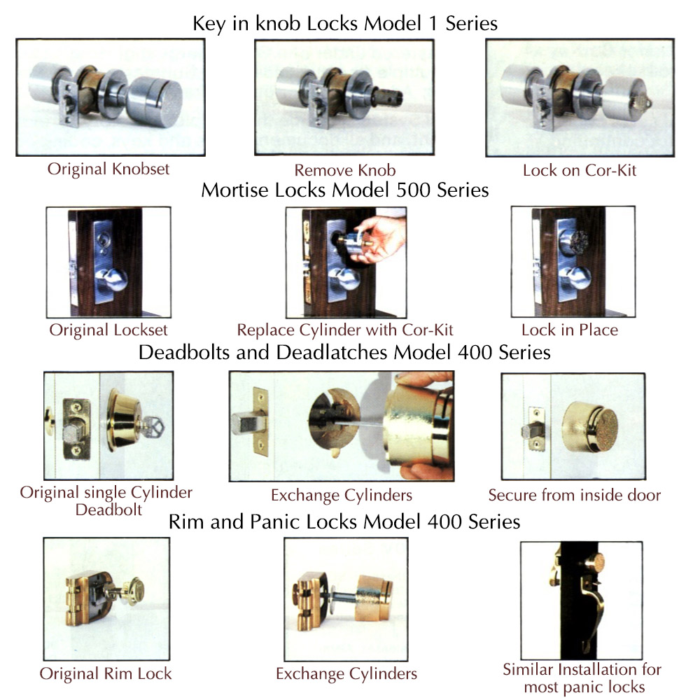 Coding Equipments: Coding manual with Large Encoding and Re-Keying Kit contains all tools and fixtures needed to code CORKEY and change codes in CORKEY locks. Complete with self-teaching Instruction Book, Code Format Cards and Spare Parts. All Factory Turnkey Master keyed Systems include this Kit plus complete coding documentation so you can take it from there, encoding, CORKEY and changing lock codes as needed.