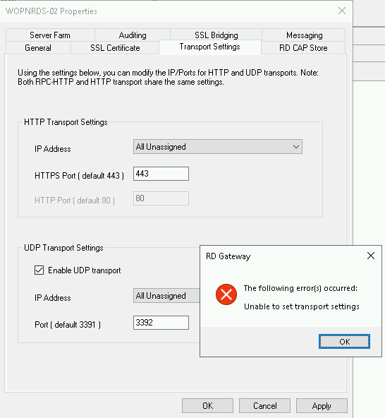 When editing any settings on the TransPort Settings tab of the RD Gateway server properties you get a message saying “Unable to set transport settings”: