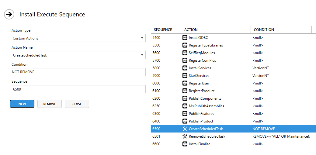 And then the create and remove custom actions need to be added to the Install Execute Sequence in the MSI at the desired position in the installation process.