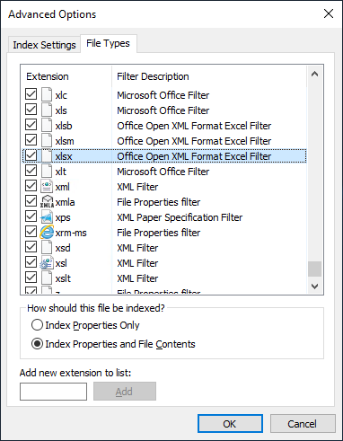 Then make sure that both .pptx and .xlsx are checked under Control Panel → Small/Large Icons view → Indexing Options → Advanced → “File Types” tab: